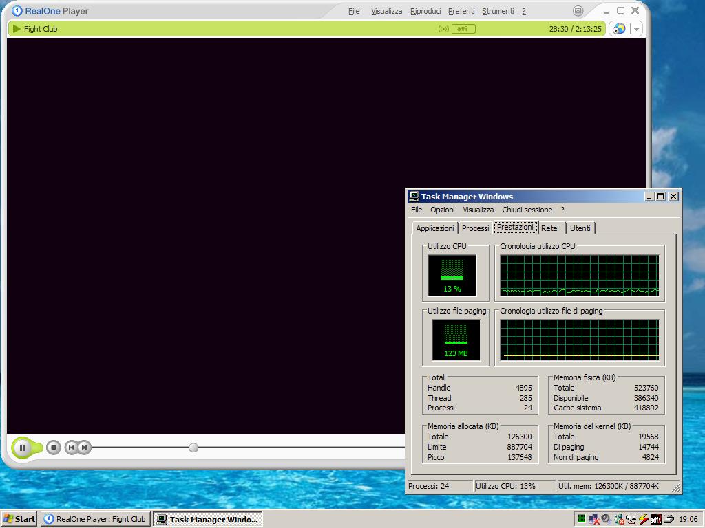 Guardate questo screenshoot: sfortunatamente non sono riuscito a catturare l'immagine del film (ho usato STAMP della tastiera) comunque notate l'utilizzo della CPU: solo 13%!!! Va da 10 a 15!!! E la CPU è un XP 2000+, niente di chissà che! Per rete sentivo dire di utilizzi del 50-60% con le Radeon 9500/9700!!! Ma è possibile?