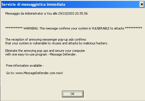 di solito sono messaggi che mettono apposta per farti credere che tu sia sotto attacco..se noti infatti ti invitano a scaricare un fantomatico programma chiamato messagedefender... al 99,999999999% è una semplice finestra pop-up di internet explorer..